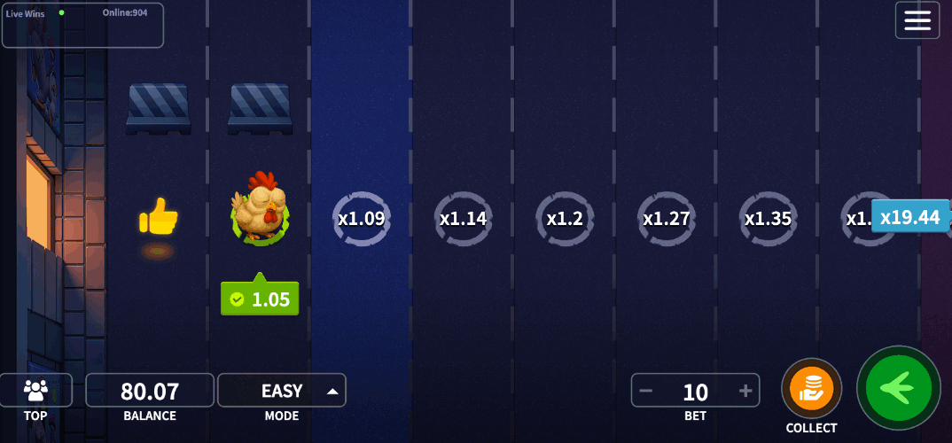 - Place Your Bet & Start: Click Play to begin the chicken’s adventure across the lanes