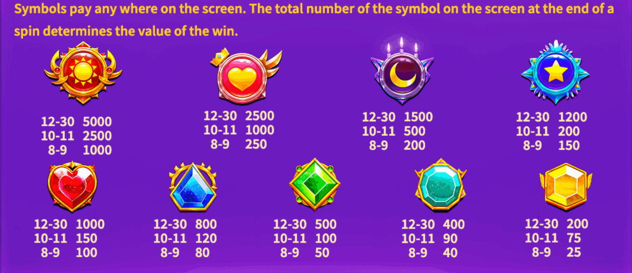 Starlight Princess uses an "anywhere on the screen" payout system, where the total number of symbols on the screen at the end of a spin determines your win. The game offers 8 different symbol reward levels, with the highest reward reaching up to 5000x your bet! For example: collecting 12–30 high-level symbols awards 5000x, 10–11 symbols award 2500x, and 8–9 symbols award 1000x.